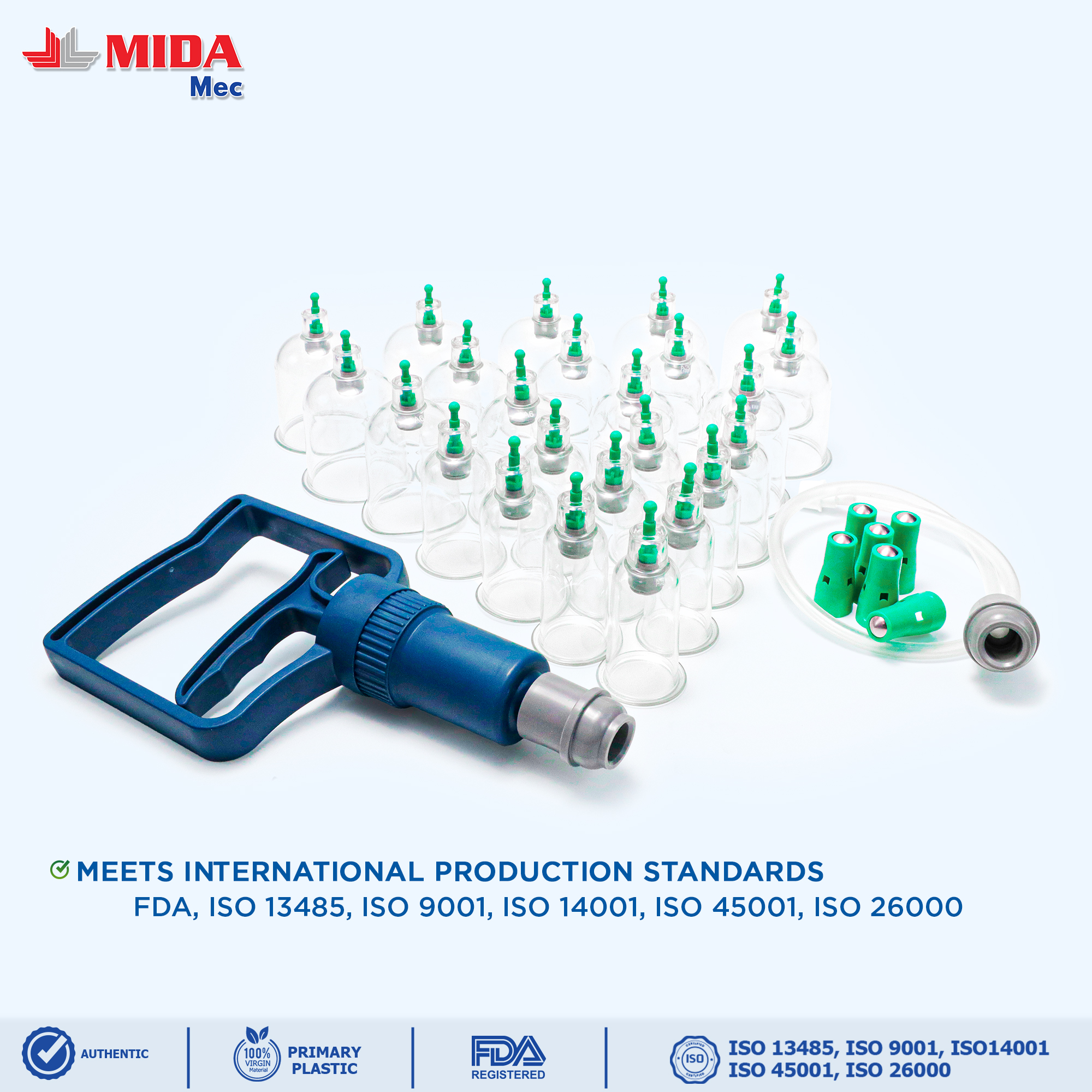 - High quality, meets international standards: The cupping set is manufactured to FDA, ISO 13485, ISO 26000, ISO 9001, ISO 14001, and ISO 45000 standards, ensuring quality and safety for users.